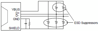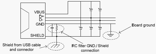 На рисунке: ограничители перенапряжений Ограничители перенапряжений могут быть как дискретными компонентами, так и специализированными интегральными схемами защиты USB интерфейса. 3.3.3. Электромагнитная совместимость. Следует обратить внимание на подключение экрана USB FS кабеля к плате устройства. Особое внимание должно быть уделено соединению между землей платы и экраном кабеля и коннектора. Непосредственное подключение экрана к земле платы создаст прямое соединение с земли платы на экран кабеля и превратит USB кабель в антенну. Для уменьшения антенного эффекта кабеля USB рекомендуется производить подключение экрана кабеля к земле платы через RC фильтр, как показано на рисунке 3.5. Типовые значения: R = 1 МОм, С = 4.7 нФ.
