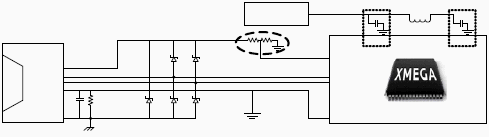 На рисунке: экран кабеля и коннектора, RC-фильтр между землей и экраном, земля платы 4. Типовые USB решения на базе микроконтроллеров XMEGA. Микроконтроллеры XMEGA со встроенным модулем USB обеспечивают высокую легкость реализации USB соединения благодаря минимальному числу необходимых внешних компонентов: