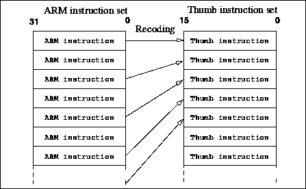 Так как Thumb -ориентированные ядра способны выполнять и стандартную ARM систему команд и новые команды Thumb, разработчик, при переходе от подпрограммы к подпрограмме, может находить компромисс между размером кода и производительностью, подготавливая критичные к размеру подпрограммы в коде Thumb и критичные к производительности подпрограммы в кодах ARM.