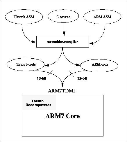 омплект средств разработки программного обеспечения ARM также был расширен, чтобы обеспечить поддержку разработки кодов Thumb. Комплект позволяет программисту писать и размещать в памяти системы коды ARM, коды Thumb или оба вместе.