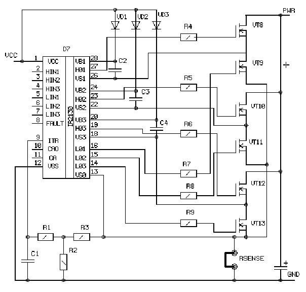 На рис.6 приведена схема подключения драйвера трехфазного моста IR2130 с использованием функции защиты от перегрузки. Для этой цели используется вход ITR. Напряжение срабатывания защиты - 500мВ. Для измерения полного тока моста в эмиттерах установлен резистор RSENSE, номинал которого вместе с делителем R2, R3 определяет ток защиты.