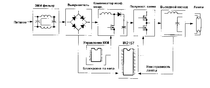 Функциональное описаниеВведениеДемонстрационная плата IR2157 состоит из фильтра электромагнитных помех, узла активной коррекции коэффициента мощности, узла управления балластом и выходного узла обеспечения резонансного режима работы лампы. Узел активной коррекции коэффициента мощности представляет собой повыщающий конвертер, работающий в режиме нормируемой проводимости и режиме частоты свободных колебаний. Узел управления балластом обеспечивает управление модуляцией частоты резонансного RLC контура лампы и легко адаптируется к различным типам ламп. Узел управления балластом также содержит схемы, необходимые для определения неисправности лампы, отключения и автоматического возобновления работы. Все функциональные описания выполнены по принципиальной схеме демонстрационной платы IR2157.