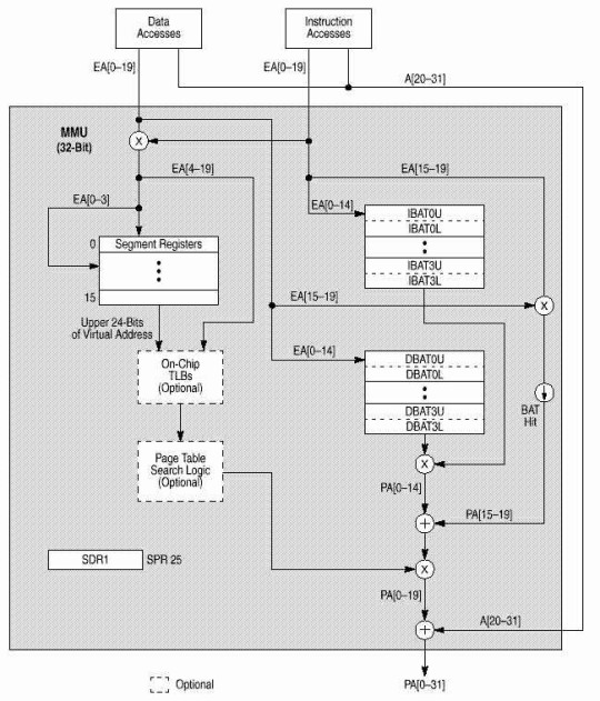 Если работает преобразование адресов, MMU преобразует старшие биты эффективного адреса в физический. Если адрес найден в массиве BAT, то физический адрес выдается сразу, иначе 32-битный эффективный адрес расширяется в 52-битный виртуальный замещением 24 старших битов на сегментный регистр, адресуемый 4 старшими битами ЕА. 52-разрядные виртуальные адреса разделены на 4 Кб страницы, отображаемые в физические. Младшие биты адреса одинаковы и используются для вычисления индекса в массиве тэгов кэша. После преобразования адресов MMU посылает физический адрес в кэш и данные считываются. Если кэш не используется или данных в нем нет, то не преобразованные младшие биты соединяются с преобразованными старшими в 32-разрядный физический адрес, который используется для доступа к внешней памяти.