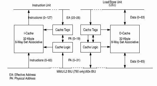 В 750 реализованы отдельные 32 Кб кэши для команд и данных (Гарвардская архитектура). Оба кэша восьмиканальные частично ассоциативные. По архитектуре PowerPC кэши адресуются физически, реальный адрес хранится в директории кэша. Оба кэша организованы в блоки по 32 байта. Блок кэша - блок памяти, для которого описано состояние когерентности. Для каждого банка данных кэша используется алгоритм PLRU (pseudo least-recently-used) замены данных (алгоритм изложен в документации). Когерентность данных глобальной памяти и данных в кэше производится по протоколу MEI процедурой слежения (snooping) по шине когерентности. Состояния когерентности для кэша данных: Modified (Exclusive) (M), Exclusive (Unmodified) (E), Invalid (I). Для кэша команд: Invalid (INV), Valid (VAL). Каждый кэш можно сделать недействительным (invalidate) установкой соответствующих битов в специальных регистрах (HID0). При непопадании в кэш, блоки заполняются за 4 прохода по 64 бита. Двойные слова одновременно записываются в кэш и в запрашивающее устройство, минимизируя задержки. Оба кэша тесно связаны с устройством шины интерфейса (bus interface unit, BUI). BUI получает запросы от кэшей и выполняет эти операции в соответствии с протоколом 60х. BUI предоставляет очереди адресов, логику приоритетов и логику контроля шины. Кэш данных предоставляет буферы для сохранения и загрузки операций шины. Все данные из соответствующих адресных очередей помещены в кэш данных. В кэше данных также производится сохранение тэгов, требуемых для когерентности с памятью и замещение блоков кэша функциями PLRU. Кэш данных организован в 128 банков по 8 блоков. Каждый блок содержит 32 байта, 2 бита состояния и адресный тэг. Каждый блок кэша содержит 8 последовательных слов из памяти которые загружаются с границы в 8 слов (т.е. биты ЕА[27-31] равны 0): таким образом блок кэша никогда не пересекает границу страницы. Не выровненные обращения через границу страницы могут повлечь уменьшение производительности. Во время загрузки данных кэш не блокируется для внешних доступов до полной загрузки.