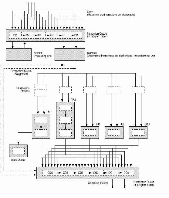 Поток командКак видно из рисунка, устройство управления потоком команд состоит из устройства последовательной выборки (fetcher), очереди из шести команд (instruction queue, IQ), устройства распределения команд и устройства обработки переходов (BPU). Оно определяет адрес следующей команды для выборки по информации из устройства выборки и BPU. Команда загружается из кэша команд в очередь команд. BPU извлекает команды перехода из последовательного загрузчика. Команды перехода, которые не могут быть обработаны немедленно, предсказываются с помощью специальных алгоритмов динамического или статического (определен архитектурой) предсказания переходов. Команды перехода, не влияющие на LR или CTR (регистры, содержащие адреса переходов), удаляются из потока команд. Команды из предсказанной ветви не завершаются, пока переход не обработан наверняка, сохраняя программную модель последовательного выполнения. Если переход был неправильным, устройство выполнения уничтожает все предсказанные пути команд и выбирает команды из правильной ветви. Очередь команд и устройство распределенияОчередь команд (IQ) содержит шесть команд и может быть загружена четырьмя командами за такт. Устройство выборки пытается загрузить команды на все свободные места в очереди. Все команды распределяются к соответствующим устройствам выполнения (IU1, IU2, FPU, LSU, SRU) из двух верхних позиций в очереди с максимальной скоростью две за такт. Устройство распределения проверяет зависимости регистров источника и приемника, определяет свободна ли место в очереди завершения команд, и распределяет последовательные команды по назначению. Устройство обработки переходовBPU получает команды перехода из устройства выборки и делает упреждающий поиск условных ветвей для их раннего предсказания, достигая попадания в большинстве случаев. Команды безусловного перехода или с известным условием могут быть предсказаны сразу. Для переходов с неопределенными условиями используется динамическое или статическое предсказание. Команды из предсказанной ветви выполняются, но не завершаются и не записывают результаты до подтверждения корректности перехода. Динамическое предсказание использует таблицу истории переходов (BHT) из 512 записей, кэш который содержит по 2 бита, определяющие 4 уровня вероятности перехода. Когда динамическое предсказание запрещено переход выбирается исходя из бита в коде команды для предсказания условных переходов. Когда переход сделан ( или предсказан), команды из остальных ветвей удаляются и загружаются команды из нужной ветви. BTIC - кэш на 64 элемента, содержащий команды из последних переходов. Когда команды находятся в BTIC, они считываются на следующем такте, иначе через один такт. BPU содержит сумматор для вычисления адресов переходов и использует три регистра - регистр связи (LR), регистр-счетчик (CTR) и CR. BPU вычисляет точку возврата из процедуры и сохраняет результат в LR определенных команд перехода. Также в регистрах LR и CTR содержат адреса для некоторых команд обработки переходов. Из-за использования специальных регистров обработка команд переходов независима от выполнения целочисленных команд и команд с ПТ. Устройство завершения командВ точке распределения команд, порядок выполнения команд поддерживается назначение команде места в очереди завершения на 6 мест. Устройство
