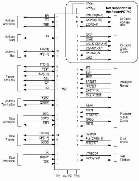 В течение такта кэш данных предоставляет для считывания в LSU двойное слово. Как и кэш команд, кэш данных может быть сделан недействительным (invalidated) весь или поблочно. Данные кэша делаются недоступными и недействительными сбросом HID0[DCE] и установкой HID0[DCFI], кэш данных может быть заблокирован установкой HID0[DLOCK]. Тэги кэша имеют один порт, поэтому одновременная загрузка/сохранение и обращения для когерентности кэша вызывают конфликт, при этом LSU внутренне блокируется на один такт для записи блока данных в 8 слов в буфер обратной записи. Кэш команд также состоит из 128 банков по 8 блоков. Каждый блок состоит из 32 байтов, 1 бита состояния и адресного тэга. За один цикл кэш команд предоставляет до 4 команд в очередь команд. В кэше команд поддерживаются только состояния верно/неверно (valid/invalid) для данных. Кэш команд не отслеживается, поэтому если изменяется память, данные которой содержатся в кэше, программа должна сообщать об этом устройству выборки команд. Кэш команд может быть сделан недействительным весь или поблочно. Доступ к кэшу запрещается и кэш делается недействительным сбросом HID0[ICE] и установкой HID0[ICFI], кэш блокируется установкой HID0[ILOCK]. В 750 реализован также кэш команд переходов (branch target instruction cache, BTIC). В BTIC хранятся встретившиеся в программе команды переходов/циклов. Если команда находится в BTIC она поступает в очередь команд на такт быстрее, чем из кэша команд. Системный интерфейс. Схема выводов процессора