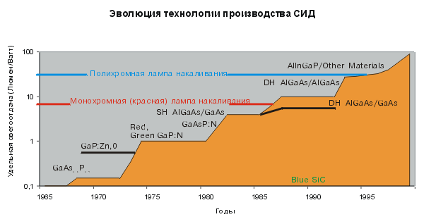 Очень показателен график (Рис. 1), заимствованный авторами из рекламной визитной карточки фирмы HEWLETT PACKARD. На графике отражена в хронологическом порядке вся эволюция в технологии производства полупроводниковых структур для СИД на этой фирме, непрерывно ведущая к росту основного параметра - силы света.