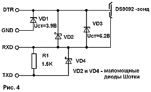 Схема эта показана на Рис.4. В ней могут быть использованы отечественные кремиевые маломощные стабилитроны типа КС139 и КС162 и любые маломощные диоды Шотки типа КД808. Dallas Semiconductor поставляет адаптер DS9097, который внешне оформлен в виде стандартной розетки 9-ти или 25-выводного разъема последовательного порта. Распаянная внутри адаптера схема аналогична показанной на Рис. 4. Этот адаптер обеспечивает расстояния в десятки метров до контактной площадки и для простых линий с одним узлом приема информации его вполне достаточно. Схемы на расстояния до узла контакта в сотни метров сложнее незначительно. В них используется драйвер однопроводной линии DS2480.